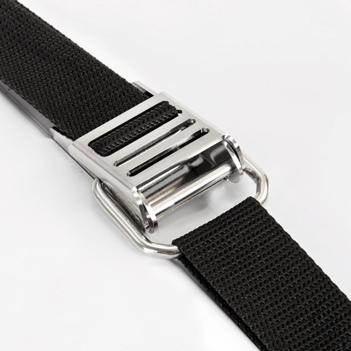 Fibbie autobloccanti a sgancio rapido e fasce in poliestere pesante con cuciture ad alta resistenza.